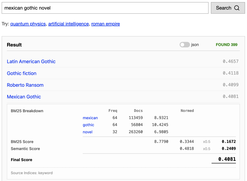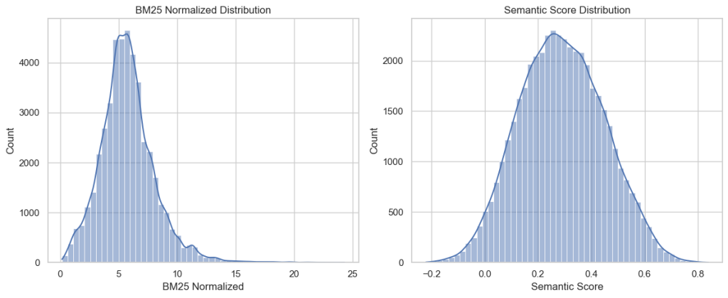 This normalization doesn’t ensure we’re getting the best results. It may be that BM25 provides better results than the semantic score and should be given a heavier weight. Or maybe, there types of queries where one should be favoured over the other. But for now, at least the two scores are comparable.