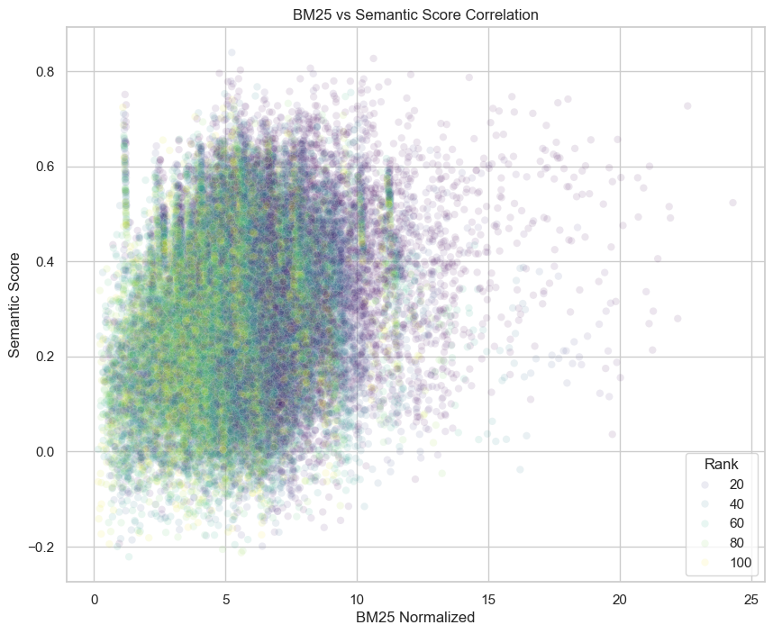 Coming back to the correlation problem, I ran the numbers and found a Pearson correlation coefficient of 0.227. This is a weak correlation, though there is a discernible trend. Gemini was very reassuring saying “This weak correlation is common in search and information retrieval tasks, where traditional keyword matching (BM25) and modern semantic understanding often capture different aspects of relevance.”