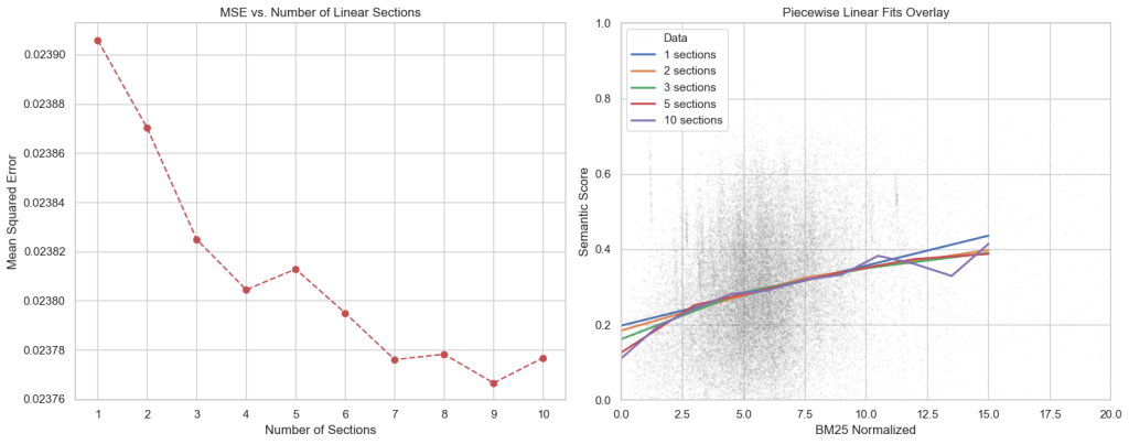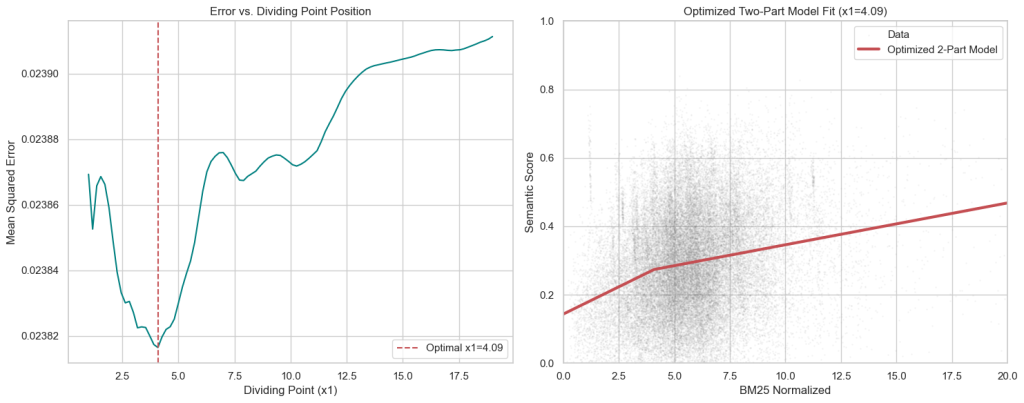 You can see that they’re on completely different scales. I decided to normalize the BM25 scores to the same range as the semantic scores and try to minimize the means squared error in the process.