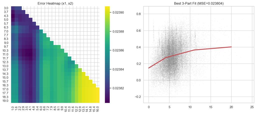 The errors are between 0.02390 and 0.02376. So, there’s not a wide range. More complicated curves don’t fit much better. If we use piecewise linear function with two pieces and minimize where the change in slope is, we find the kink at x=4.0909 and an error of 0.023816.