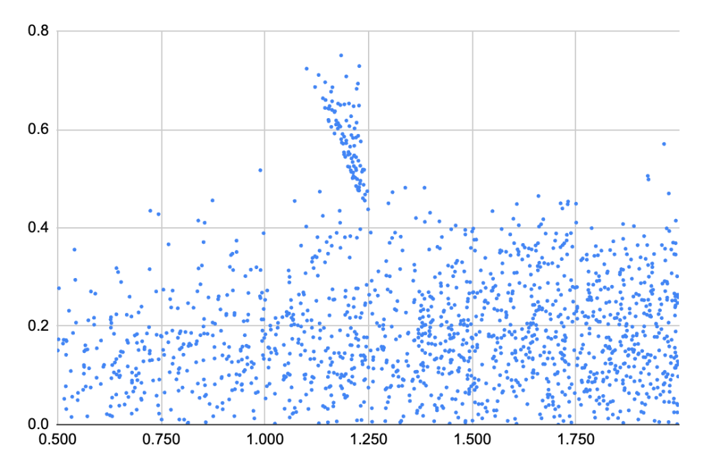 These give a smear of a scatter plot when we plot the semantic and BM25 scores. If these were strongly correlated, then I’d be concerned that they’re both providing the same information and they’d be redundant. If they were completely uncorrelated (which looks more likely) then it would seem they’re not even answering the same question.