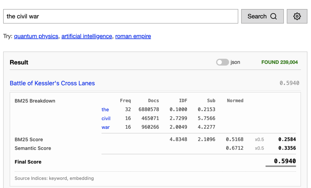 In particular, any search query with a common term (e.g. “the” or “history”) would have lower BM25 scores compared to the semantic scores. The reason for this was I was dividing BM25 by the number of terms in the query. I included that normalization, because otherwise adding more terms to the query would simply add to the overall BM25 score. For example,